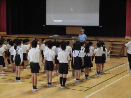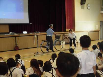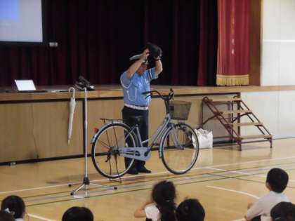 平野警察署交通安全課からお巡りさんに来ていただき、3年生から6年生の児童が自転車の交通安全について講義を受けました。適切な自転車のサイズや乗り方の指導を受けました。