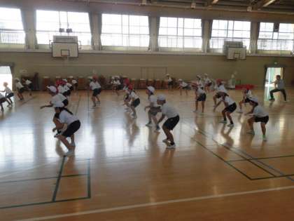 体育館で、4年生が運動会団体演技の練習をしていました。