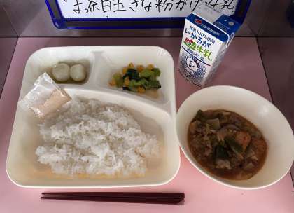 令和5年度学校給食コンクール最優秀賞献立でした。ジャージャンどうふは「家常どうふ」と書き、中国の家庭で常によく食べられている豆腐料理です。チンゲンサイのオイスターソースあえは、オイスターソースの風味とにんにくのうま味があって、ご飯によく合いました。