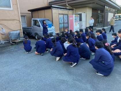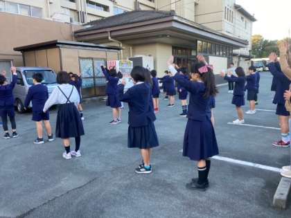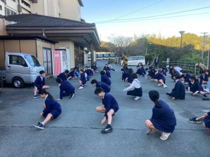 宿舎前で、朝のつどいを行ないました。係の人のあいさつの後、体操を行ないました。