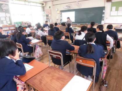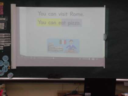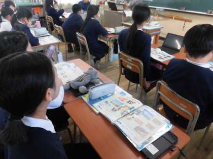 英語の授業です。タブレットを手元に置き授業が始まりました。