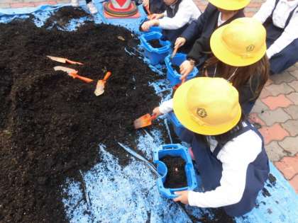 1年生が中庭で、植木鉢にチューリップの球根を植えています。
