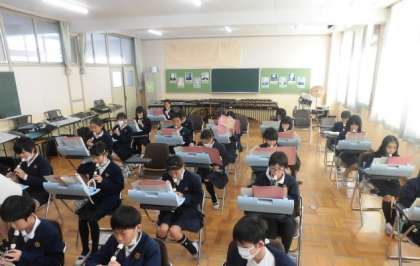 5年生が音楽室で音楽の授業を行っています。最初に全員で、歌の合唱、その後、リコーダー、けん盤ハーモニカを使って、「タイムパラドックス」という曲を合奏していました。