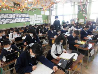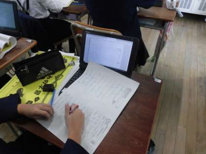 5年生の教室です。冬休みの答え合わせをしています。担任の先生がタブレットに解答を事前に入れているので、それを見ながら自分のペースで答え合わせができます。タブレットの上手な使い方です。