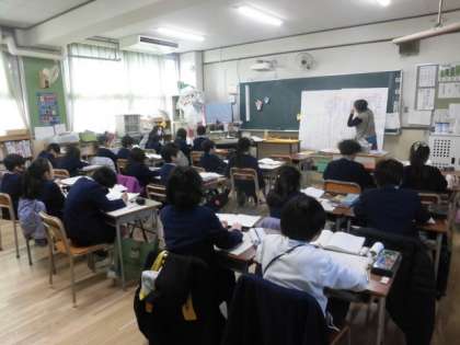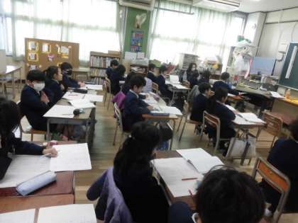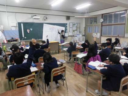 3年生の国語です。先生が模造紙を使って授業を進めています。授業で使った模造紙は、授業終了後、教室後ろに掲示して、いつでも子どもたちが復習で見ることができるようにしています。