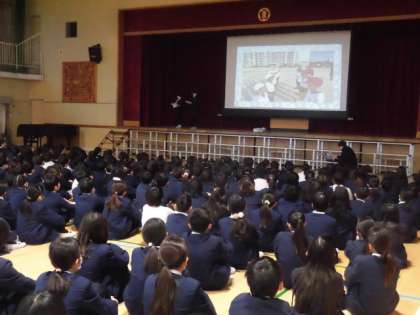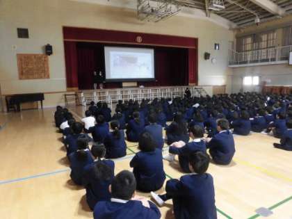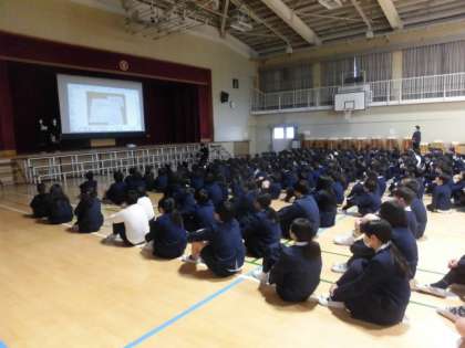 体育館でクラブの代表がクラブ紹介を行いました。スライドを使って各クラブが活動の様子を発表しました。3年生は、来年度どのクラブに所属するのかの参考にします。