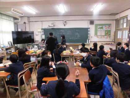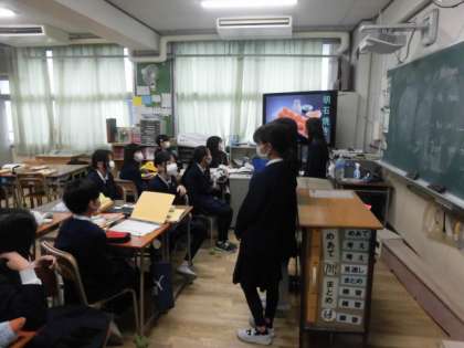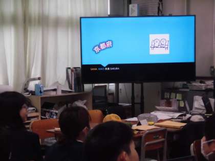 英語の授業の様子です。班別で都道府県の魅力について調べて、映像を交えて発表しています。京都府、兵庫県など、順番に英語で発表しています。兵庫県では、明石焼きの説明もありました。
