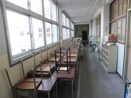 次の学年に教室を渡すので、先生方が、机、椅子を廊下に出して、