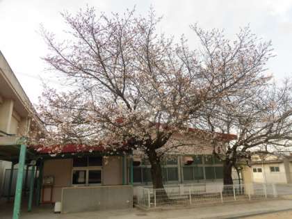 給食室前の桜が咲きだしました。
