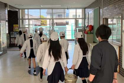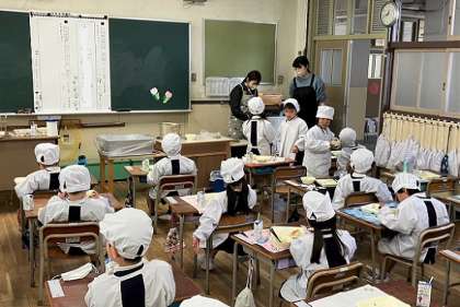 1年生は、はじめの給食。おかわりする人も、「おいしかった」「おなか、いっぱいになった」等の声も聞かれました。