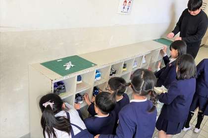 (写真:2年生「新しい組、新しい出席番号になり、くつを置く場所も変わりました。引き続き、くつはそろえて並べます。」)