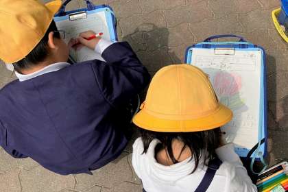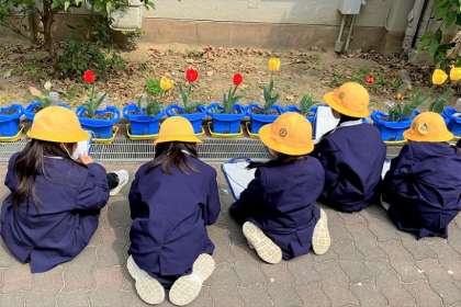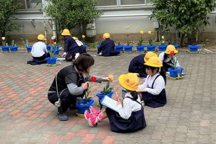 1年生のときに植えたチューリップがきれいな花を咲かせています。観察して、絵と文章で記録しました。見るだけでなく、手ざわり、においも確かめます。