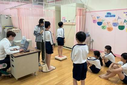 けがや体調不良の対応に加え、悩みごとも聞きます。おうちの人や友だちは、関係が深すぎて、仲が良すぎて話しにくいことも、保健室の先生が聞かせてもらいます。(写真:5年生の発育測定の様子)