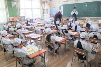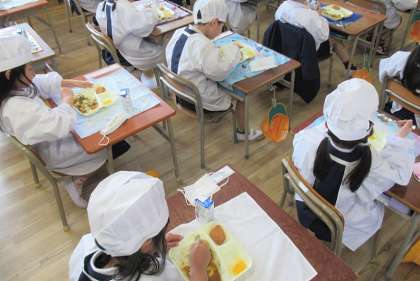 1年生の入学をお祝いした献立、子どもたちに人気のカツカレーライスとフルーツゼリー、牛乳でした。カレーライスのように調理の工程が少ない時に、調理員さんはにんじんを星やハート型にして、おかずに入れてくれます。子どもたちは、そのにんじんにあたった人には良いことがおこると言います。