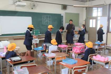 1年生も、おかずや食器等の受け取りを、自分たちで行うようになりました。下校時間の関係で、食器やおかずが入っていた食缶の返却は、6年生にまだお願いしています。
