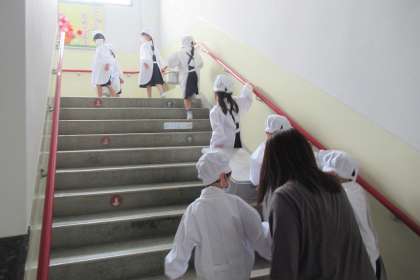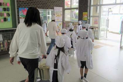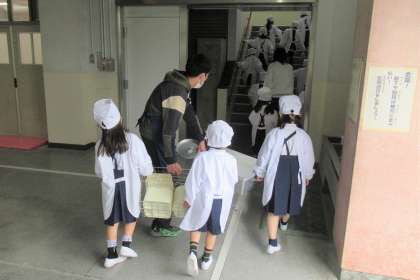 喜連小学校は、給食調理室と教室が離れており、教室へは階段を昇らなくてはなりません。1年生も、食器やおかずを慎重に運んでいます。