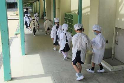 1年生は、学校生活のきまりをどんどん身につけていっています。6年生に、お手伝いをお願いしていた給食の運搬も、自分たちの手で行っています。また、本来の下校時刻まで学校で過ごしています。