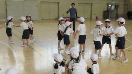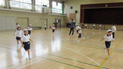 音楽が聞こえる間は、体育館中を駆けます。音楽が聞こえなくなると、体の動きを止めます。先生から「〇人」と指示が出るので、その人数に集まって、座ります。