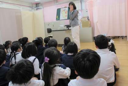 保健室の先生から耳のしくみ、聴力検査の目的や検査方法について説明を受けました。しっかりお話を聞けていました。