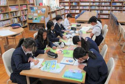 図書委員会の児童は、いろいろなジャンルの本に親しんでもらうために、押し本を紹介するポスターをつくっています。
