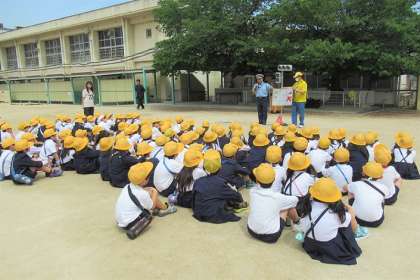 平野警察署の方、平野区地域安全対策担当の方々に来校いただき、安全な道路の歩き方、信号の渡り方について教わりました。