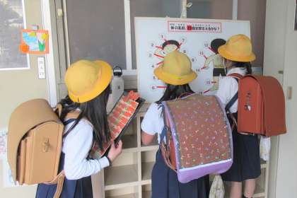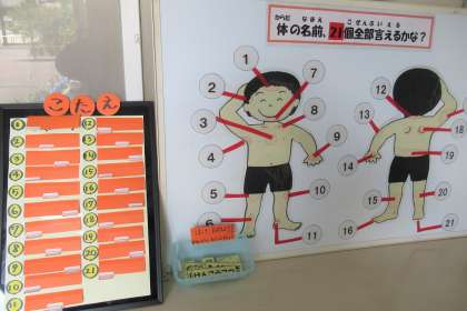 保健室の先生は、子どもたちが自分の体や健康に興味を持てるように、様々な工夫をしています。楽しく取り組む様子が見られます。