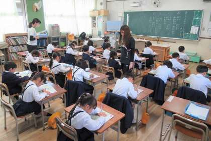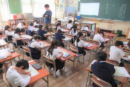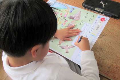 1年生は、はじめてのテストに臨みました。最初に、自分のなまえ、組、出席番号を書きます。「ともだち、あ、い、う、え、お」の文字をなぞりました。子どもたちは、緊張感を持って取り組んでいました。