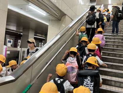 電車の中では、おしゃべりを我慢。2列で移動しましたが、列が横にひろがらないように「壁、ピタ」を、列の間があかないように「おなか、ピタ」を意識しました。