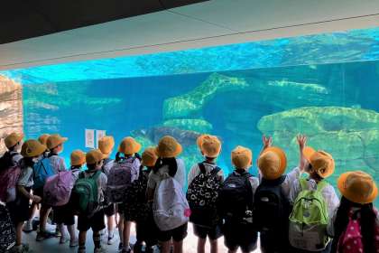 ひざしが強かったものの、熱中症を心配するほどの暑さではなかったので、いろいろな動物たちが活発に動き、フクロテナガザルは大きな声で鳴いていました。子どもたちは目を輝かせて見学していました。