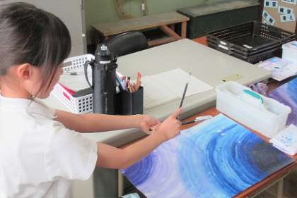 濃い色から薄い色に変化させるグラデーションや色を含んだ筆を別の筆でトントンとたたき、色を飛び散らせるスパッタリングの技法を練習し、それぞれの技法を用いて「宇宙」を描きました。