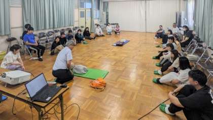平野消防署の協力を得て、水泳学習が始まるのを前に、救急救命講習を実施しました。