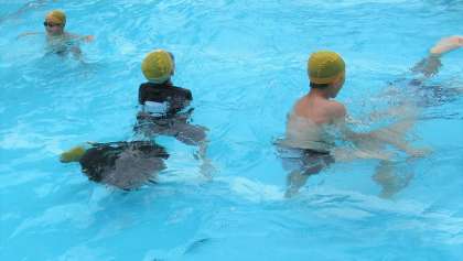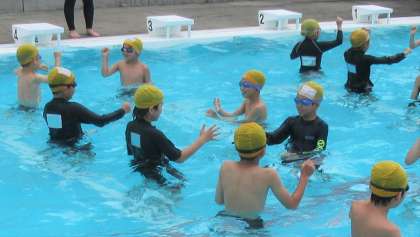 プールの学習は2日目。水慣れでは、ペアでジャンケンをし、負けた人は勝った人の股を潜ってくぐりました。