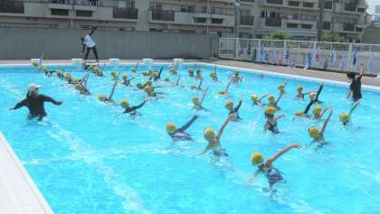 6月19日、1年生はプール学習でした。水慣れは、曲に合わせたダンスです。