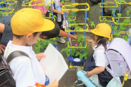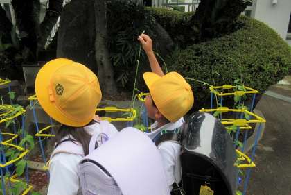 月曜日、登校してきた1年生は大喜びです。土日の間に、アサガオが、青色、赤紫色の花を咲かせていました。つるもとても長く伸びており、ビックリ。