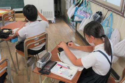 夏の林間学習で、活動時に必要な持ち物を入れるナップサックを作っています。ミシンでナップサックの両サイドを縫い、手でナップサックの口の部分を仮縫いします。針で指を刺してしまう人も、