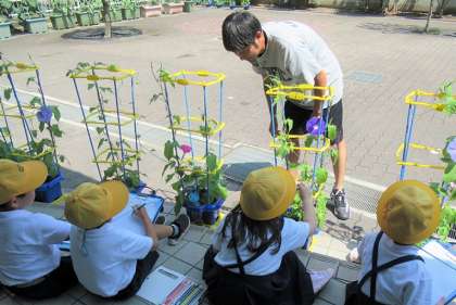 日々、大きくなる、花を咲かすアサガオに、興味津々で、気づいたことをいろいろと教えてくれました。「プランターの葉の数は47枚」「手のひらと同じ大きさの葉は3枚」「葉の毛はふわふわしている」…、