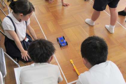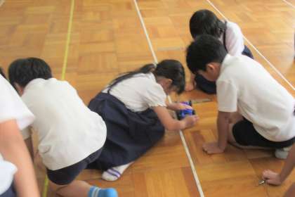 輪ゴムをのばす長さを変えていき、車が動いた距離を測りました。
