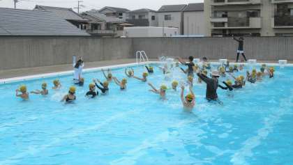 大きな小学校のプールにも慣れ、楽しく活動しています。曲に合わせて上手に踊れます。