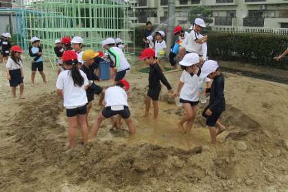泥を洗い流せるように、水着に体操服で活動しました。夢中になり過ぎて、体操服を泥だらけにした人もおり、お洗濯が大変かもわかりません。