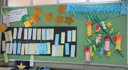 七夕にちなみ、保健室前では、願い事を書いて短冊を飾れるようにしています。短冊には、学習や習い事の上達以外にも、学年・学級のみんなが楽しく、元気で過ごせますようにと書かれた短冊もあります。