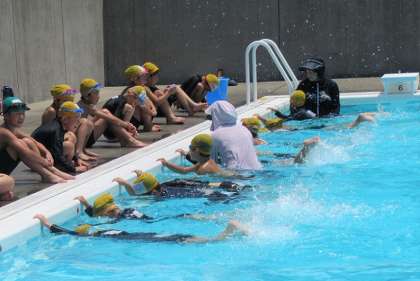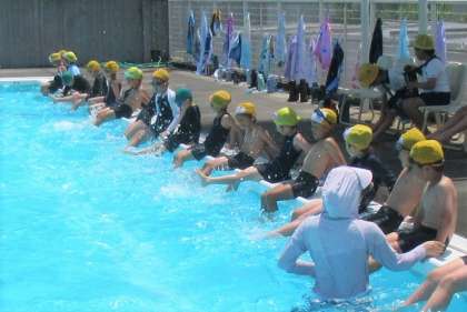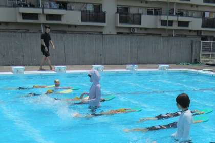 まず、プールサイドに腰をかけ、「ひざを曲げず、足先まで伸ばす」、バタ足のキックを確認しました。次に、プールサイドを持ってバタ足を、最後は、ビート板を使って泳ぎました。