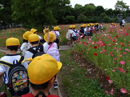 1年生にとっては小学校で初めての遠足でしたが、1・2組合同班で楽しくお弁当を食べたり、バラ園やハーブ園などでたくさんの花を見たり、大満足の遠足になりました。