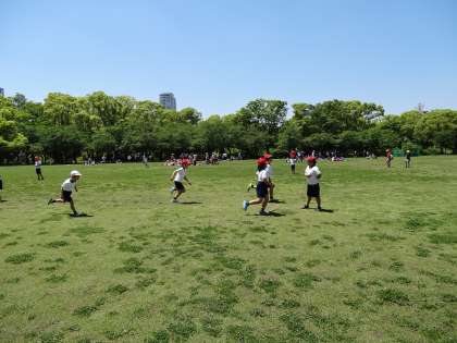 西の丸庭園では、みんなで楽しくお弁当を食べることができました。食事場所も、大阪城が見える場所で食べることができたので、とても眺めがよかったです。食後には、広い芝生の庭園で、思いっきり走ったり遊んだりして体を動かしました。