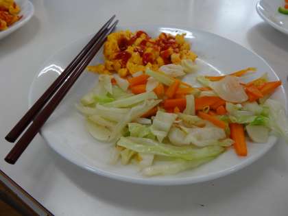 調理実習で「野菜炒め」と「スクランブルエッグ」を作りました。まずは材料の下ごしらえとして“にんじん”や“ピーマン”をせん切りに、“キャベツ”は芯を取って短冊切りにしていきました。炒めるときには、火が通りにくいものに気を付けながら順番に炒めていきました。最後は、素材の味を生かすことができるように塩とコショウで味付けしていきました。また、もう一品として「スクランブルエッグ」を作り一緒に盛り付けました。