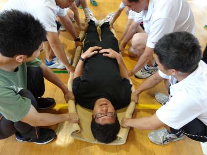 明日の土曜授業(防災学習)に向けて、消防署と区役所の方にご指導いただきました。ご指導いただいたのは、消火訓練で扱う水消火器の使い方や、搬送訓練で行う搬送方法などです。搬送訓練では、教職員が2名で搬送したり毛布だけの応急担架で搬送したりと、その場の状況に応じた搬送方法を教えていただきました。