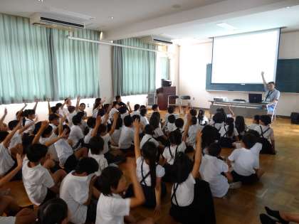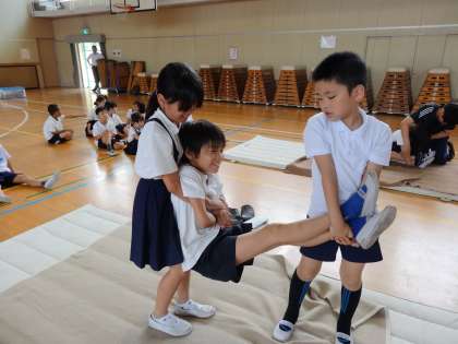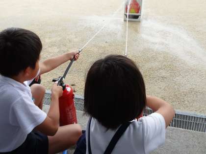 3年生は、2時間目にDVD鑑賞と防災クイズを行いました。3時間目は、前半に消火訓練、後半に搬送訓練を行いました。