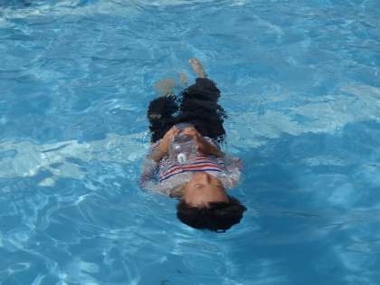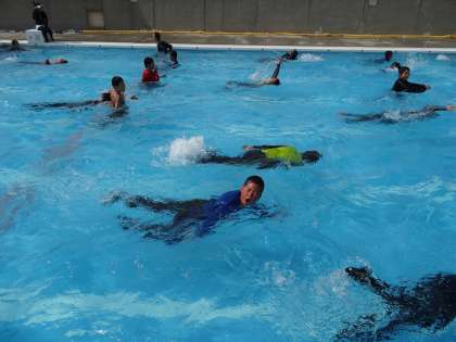 まずは実際にプールに入り、体を浮かべることから始めました。少しでも浮力を得るために、衣服に空気を貯めて浮かんだり身近にあるペットボトルを抱えたりして、救助が来るまで無駄な体力を消費しない方法をそれぞれが試しました。次に衣服を身に着けたまま25mを泳いでみました。しかし、衣服がダブついて思うようには体を動かすことができませんでした。少しの時間でしたが、水の事故の恐ろしさや事故にあったときにどうすればよいのかを知ることができました。