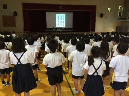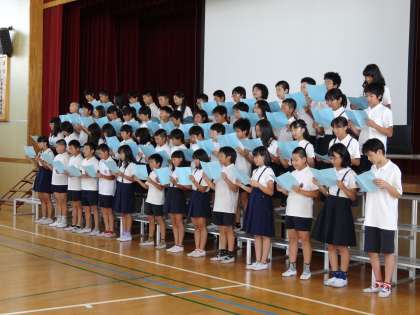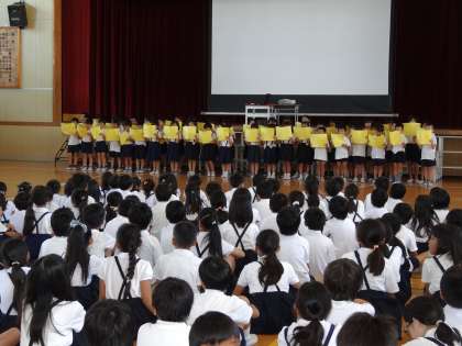 終業式の後、平和集会を行いました。平和集会では、学年ごとに1学期の平和学習で取り組んだ内容について発表を行いました。夏休みを目前に控えて、戦争や平和について考えるとても良い機会になりました。また、最後には全員で黙祷をしたり「おりづるの歌」を歌ったりしました。