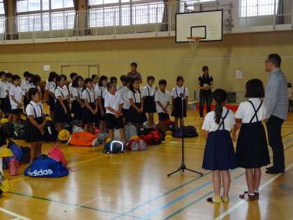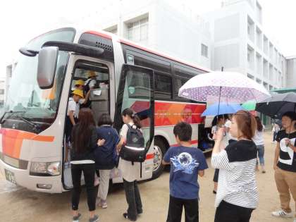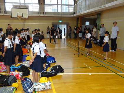 本日から2日間、楽しみにしていた林間学習が始まりました。出発に先立ち、講堂で出発式を行いました。出発式では、校長先生からのお話や、たくさん見送りに来ていただいた保護者の方々へのあいさつを行いました。天候は雨模様でしたが、子どもたちは元気よく「行ってきます!」と言ってバスに乗り込んでいきました。これからたくさんの活動をして、思い出をいっぱいつくってきます!