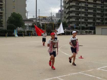 1時間目に、運動会に向けて全体練習をしました。本日の練習は、開会式を中心に行いました。開会式では、入場行進の体形や、優勝盃・準優勝楯返還、誓いのことば、運動会の歌などを練習しました。